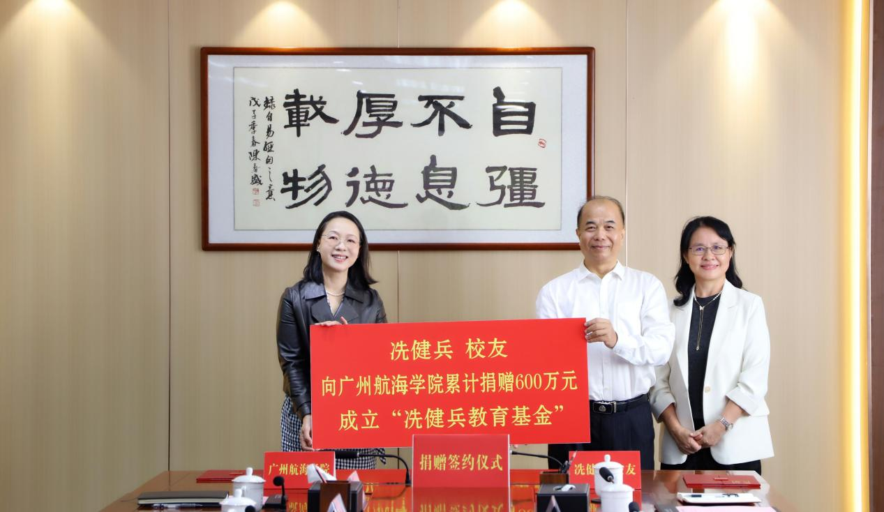 捐赠仪式温馨而热烈。冼健兵与学校签订捐赠协议,陶韶菁向冼健兵颁发捐赠证书。“从这里出发,又回到这里”,冼健兵校友深情回忆了百岁古樟守护下的求学生涯。作为交通运输部广州海运学校第一批学生以及投身海事系统工作的第一位学生,母校的培养为他绘就了发展轨迹、续写了海洋情缘;作为珠海校友分会永久荣誉会长,冼健兵校友历经母校四秩、五秩和六秩芳华,见证了母校的每一次跃迁、凝结了爱校荣校的深厚情感;作为珠海市首家民营企业党委——中共珠海市腾步党委书记,冼健兵校友坚持鲜明政治立场、永葆清正政治本色,以高质量党建引领企业治理;作为眷恋乡土、记住乡愁的游子,冼健兵校友为家乡花都区炭步镇㘵溪村捐建马路广场助力乡村振兴、每年出资举办“敬老千人宴”弘扬尊老敬老传统美德、成立“花都区秀全中学冼健兵德育基金会”关爱下一代成长,令人感佩。